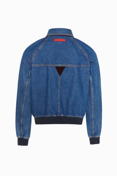 Crafted in Los Angeles from 100 percent premium American denim, lightly stone washed for a soft, lived in feel, the Denim Blouson features Italian suede leather accents and Super Lampo zippers. Finished with suede zipper pulls, raglan sleeves, ribbed cuffs, and our signature red leather label on the back, it captures timeless flight jacket style with modern refinement.